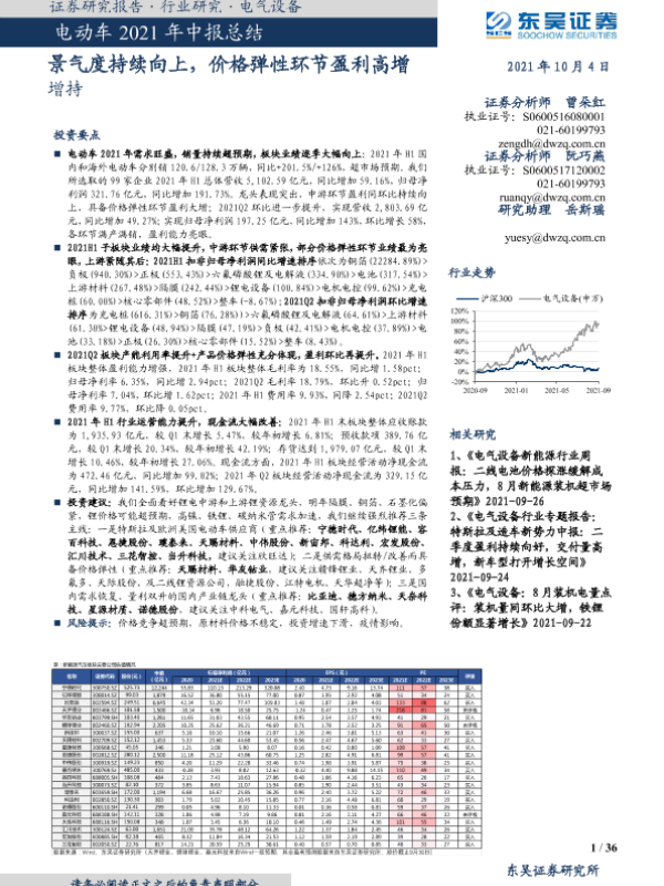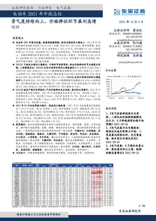 【东吴证券】【20211004】电气设备行业电动车2021年中报总结:景气度持续向上,价格弹性环节盈利高增-36页