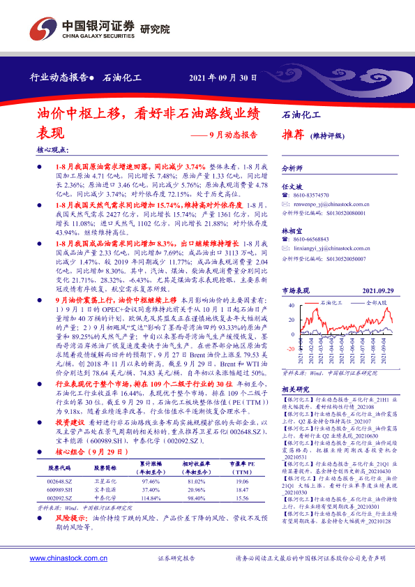 【银河证券】【20210930】石油化工行业9月动态报告:油价中枢上移,看好非石油路线业绩表现-22页