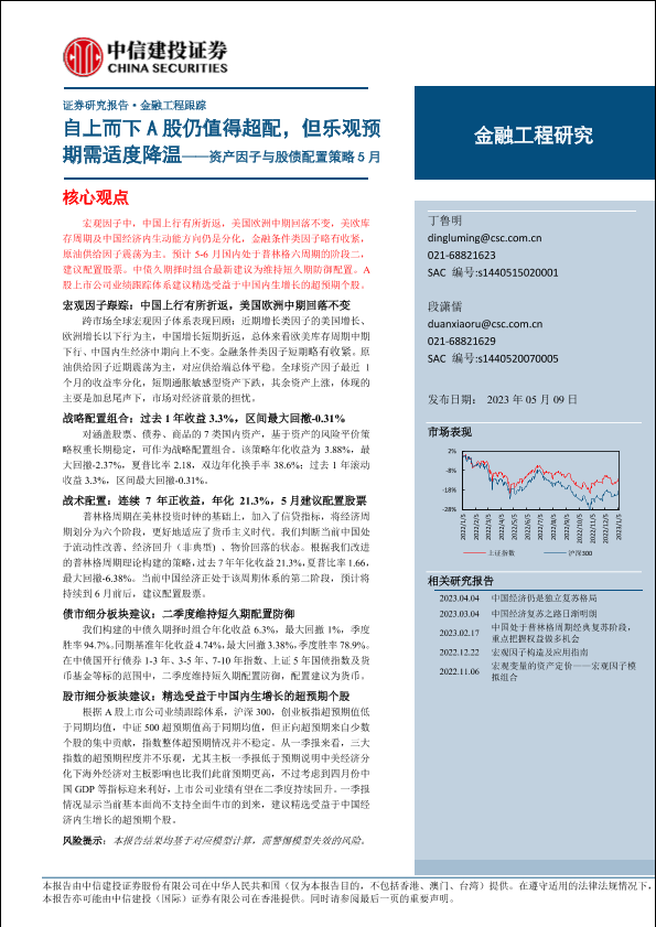 【中信建投证券】【20230509】资产因子与股债配置策略5月:自上而下A股仍值得超配,但乐观预期需适度降温-20页