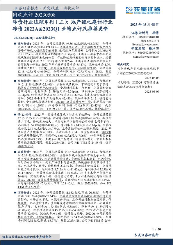 【东吴证券】【20230508】转债行业追踪系列(三):地产链之建材行业转债2022A&2023Q1业绩点评及推荐更新-20页