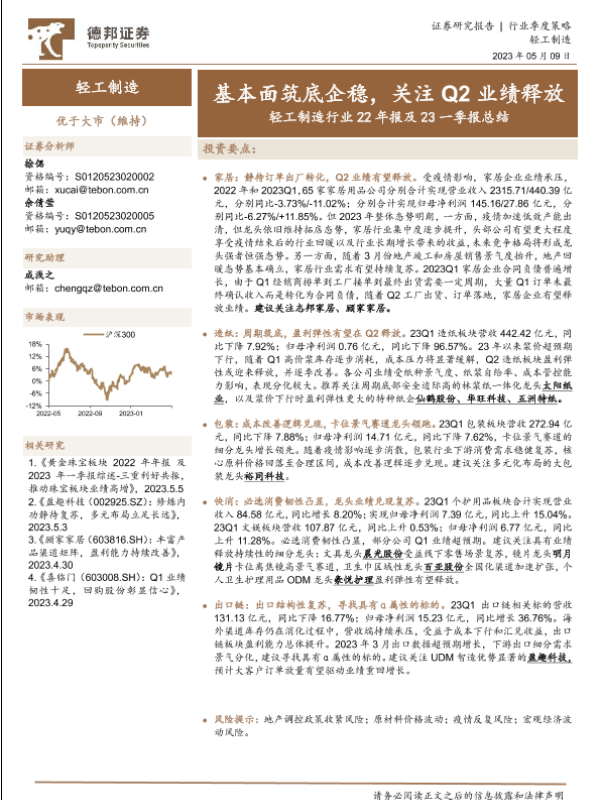 【德邦证券】【20230509】轻工制造行业22年报及23一季报总结:基本面筑底企稳,关注Q2业绩释放-44页