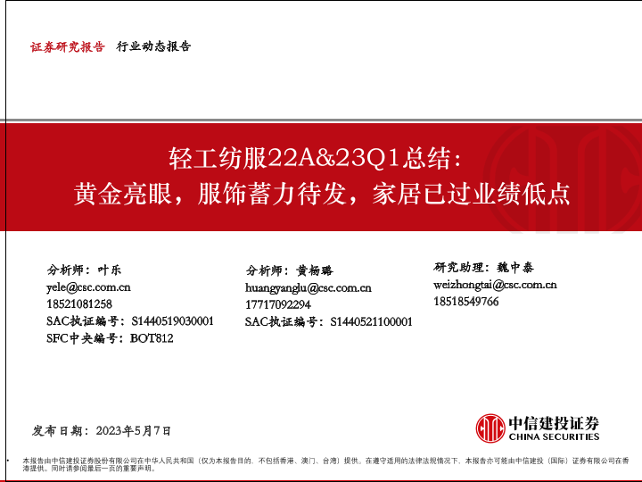 【中信建投证券】【20230507】轻工纺服行业22A&23Q1总结:黄金亮眼,服饰蓄力待发,家居已过业绩低点-56页