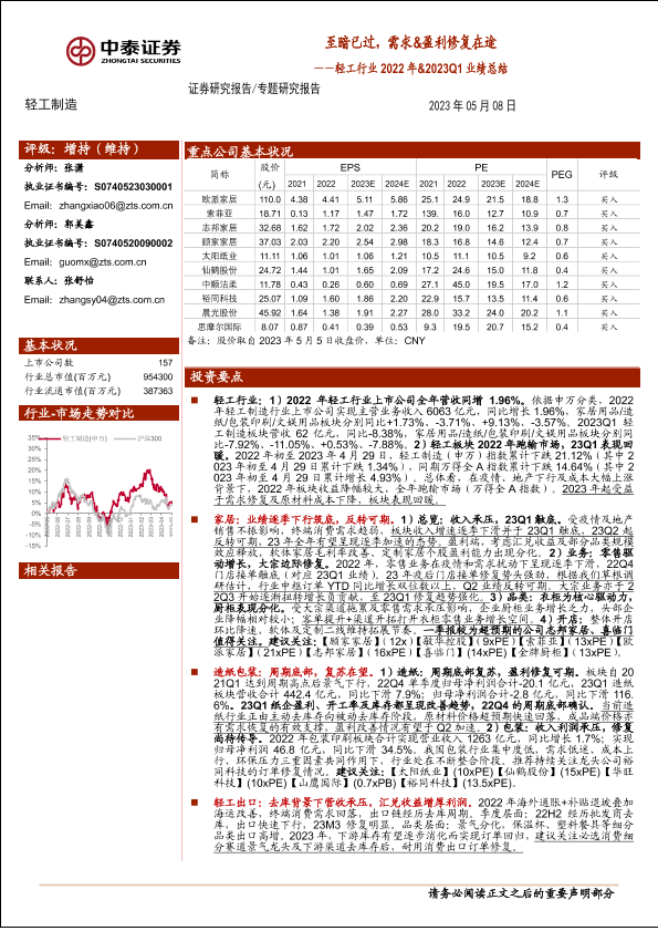 【中泰证券】【20230508】轻工行业2022年&2023Q1业绩总结:至暗已过,需求&盈利修复在途-48页