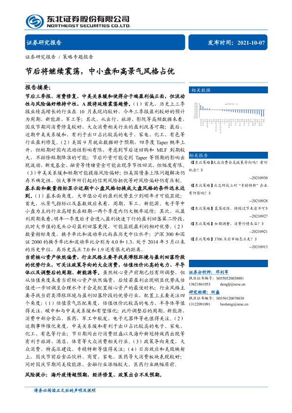 【东北证券】【20211007】策略专题报告:节后将继续震荡,中小盘和高景气风格占优-30页