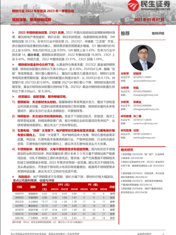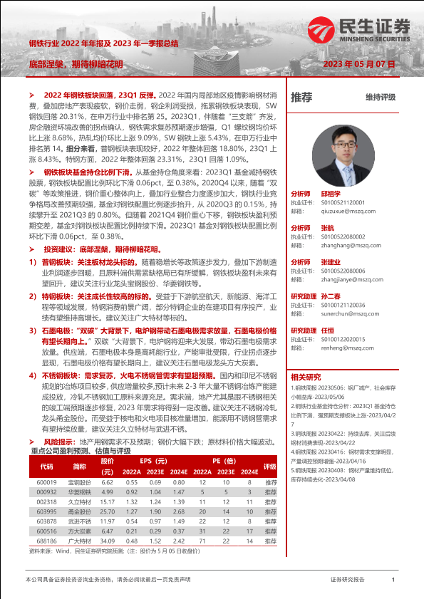 【民生证券】【20230507】钢铁行业2022年年报及2023年一季报总结:底部涅槃,期待柳暗花明-23页