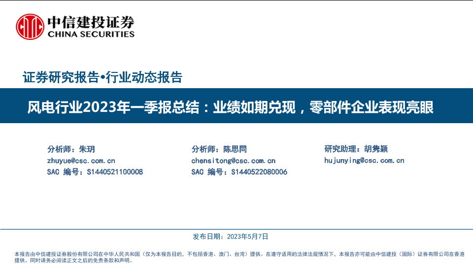 【中信建投证券】【20230507】风电行业2023年一季报总结:业绩如期兑现,零部件企业表现亮眼-25页