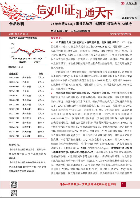 【山西证券】【20230508】食品饮料行业22年年报&23Q1季报总结及中期展望:白酒业绩分化,大众品底部复苏-33页