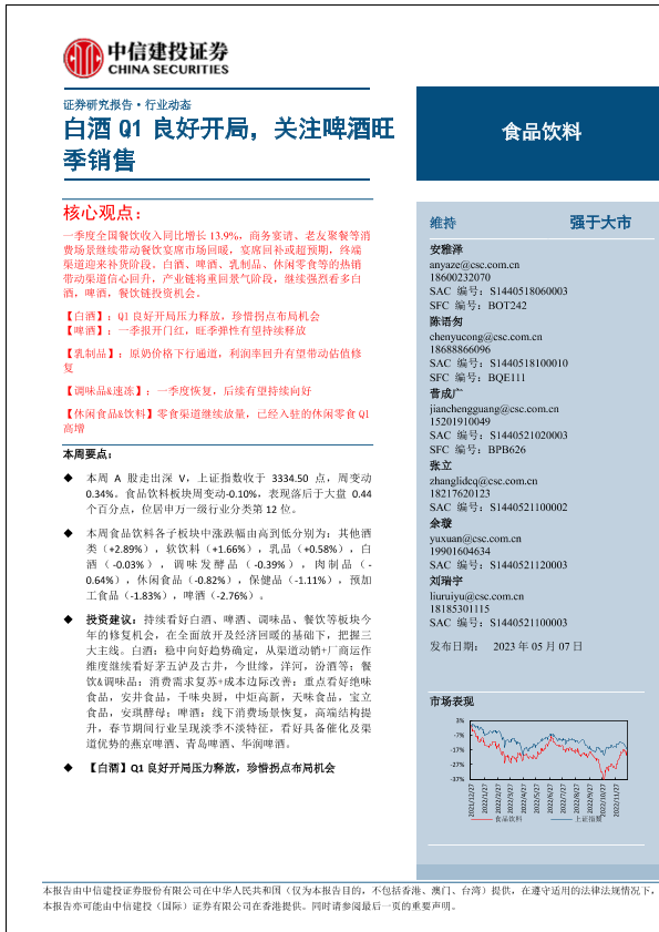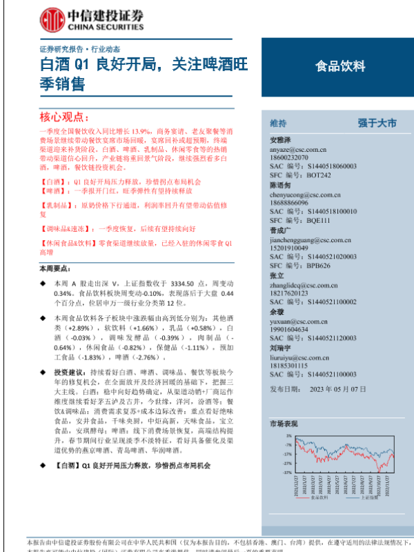 【中信建投证券】【20230507】食品饮料行业:白酒Q1良好开局,关注啤酒旺季销售-40页