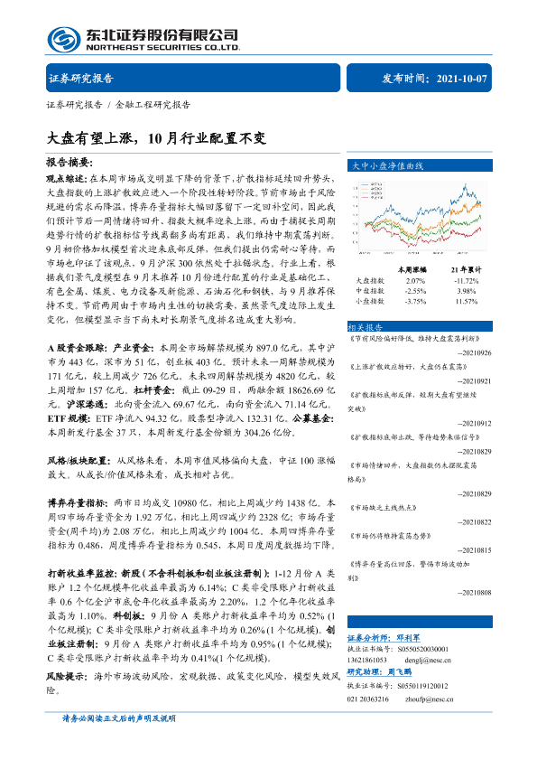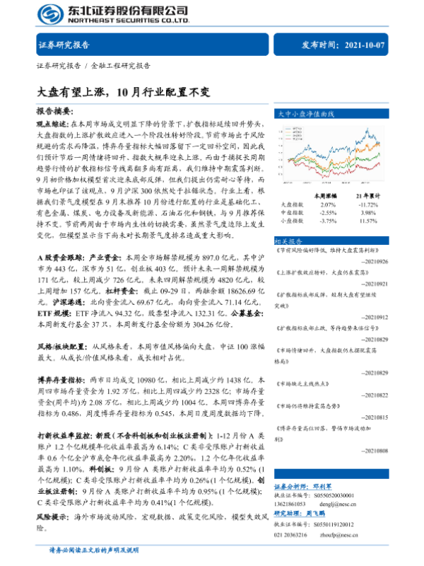 【东北证券】【20211007】金融工程研究报告:大盘有望上涨,10月行业配置不变-30页