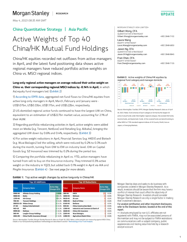 【Morgan Stanley】【20230430】Morgan Stanley-China Quantitative Strategy Active Weights of Top 40 China/HK Mutual Fund Holdings-9页