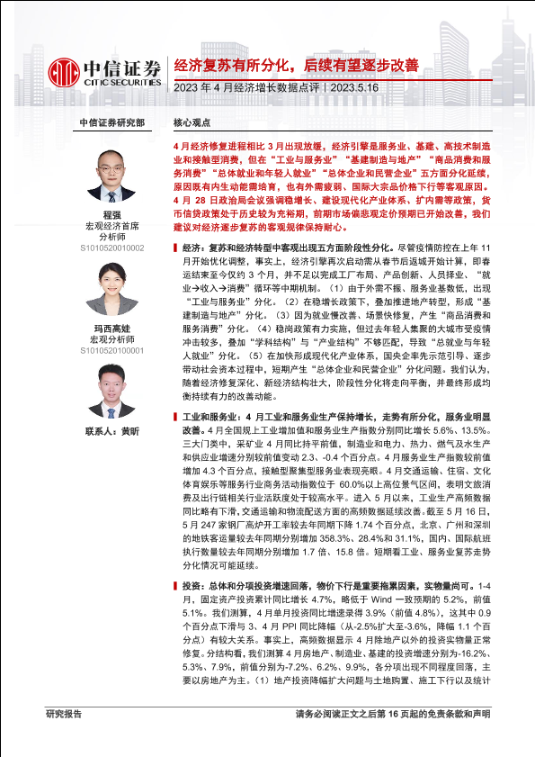 【中信证券】【20230516】2023年4月经济增长数据点评:经济复苏有所分化,后续有望逐步改善-17页