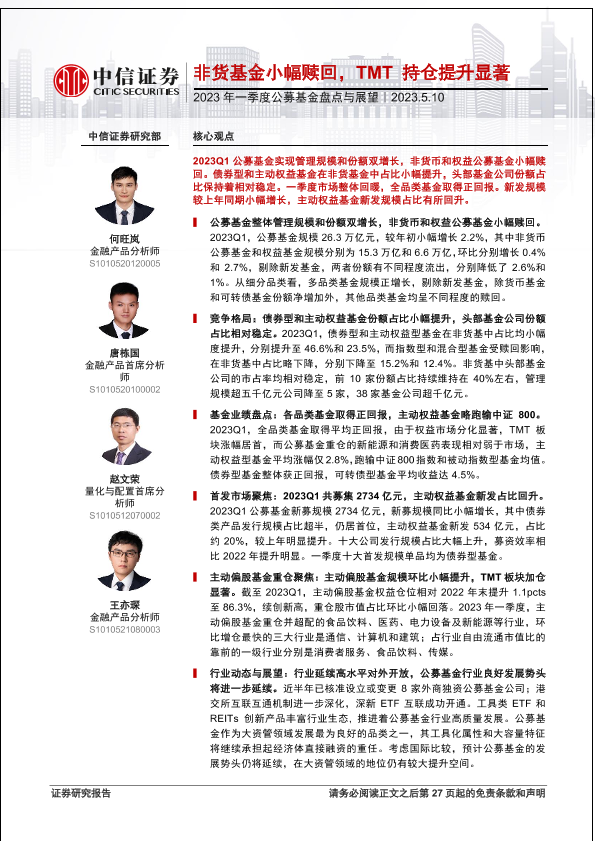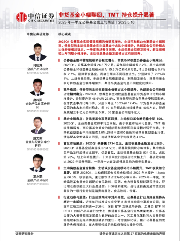 【中信证券】【20230510】2023年一季度公募基金盘点与展望:非货基金小幅赎回,TMT 持仓提升显著-28页