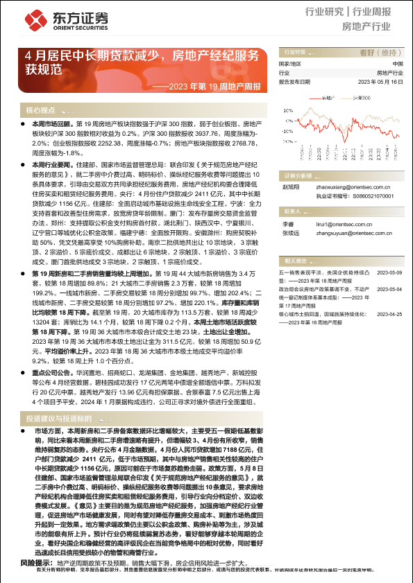 【东方证券】【20230516】2023年第19周地产周报:4月居民中长期贷款减少,房地产经纪服务获规范-15页