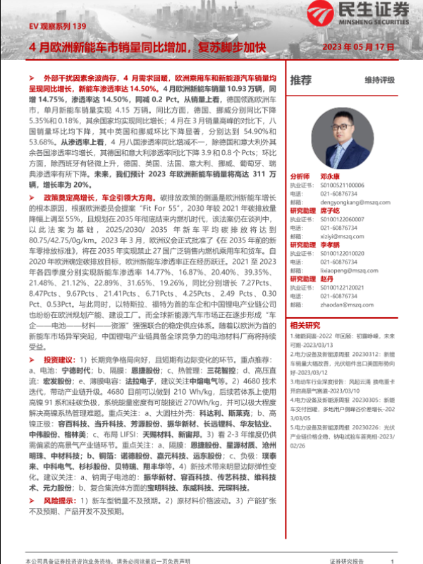 【民生证券】【20230517】4月欧洲新能车市销量同比增加,复苏脚步加快-21页