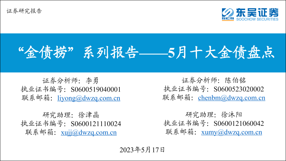 【东吴证券】【20230517】“金债捞”系列报告:5月十大金债盘点-43页