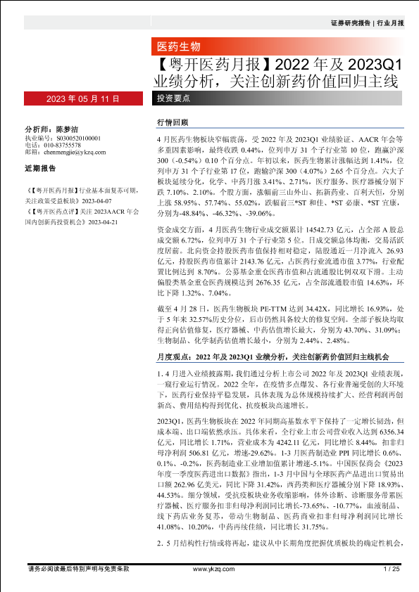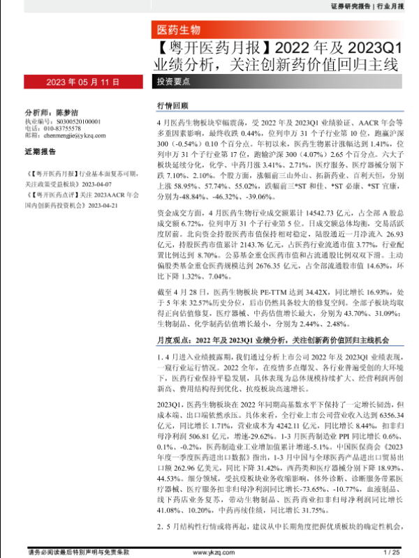 【粤开证券】【20230511】【粤开医药行业月报】2022年及2023Q1业绩分析,关注创新药价值回归主线-25页