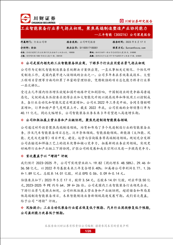 【川财证券】【20230517】三丰智能公司深度报告(300276):工业智能装备行业景气拐点初现,聚焦高端制造塑造产业协同能力-26页