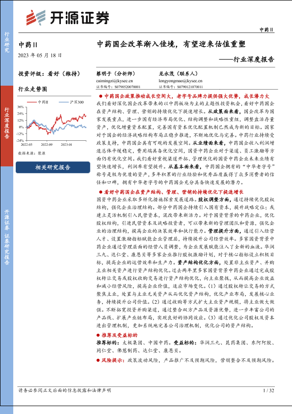 【开源证券】【20230518】中药Ⅱ行业深度报告:中药国企改革渐入佳境,有望迎来估值重塑-32页