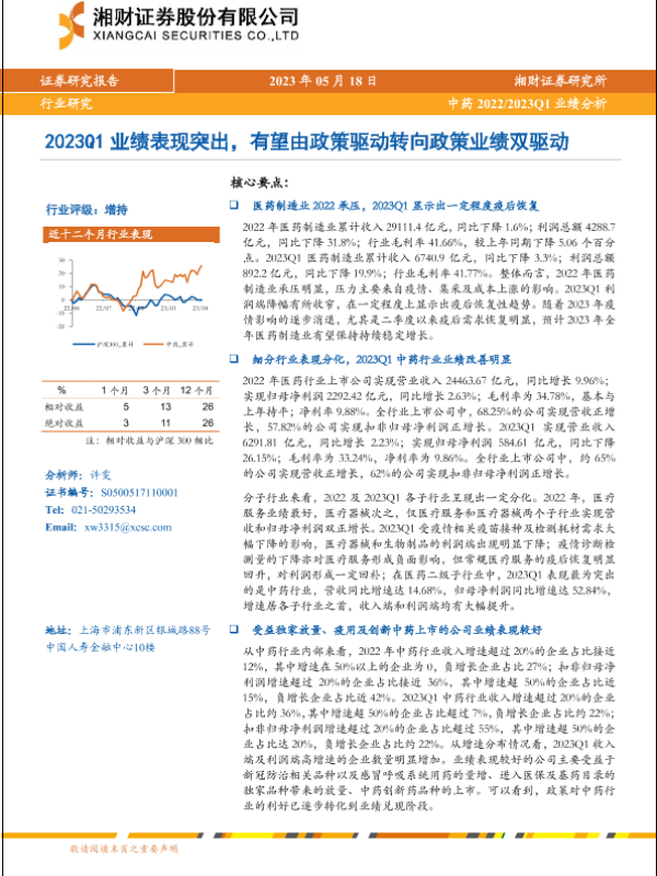 【湘财证券】【20230518】中药行业20222023Q1业绩分析:2023Q1业绩表现突出,有望由政策驱动转向政策业绩双驱动-20页