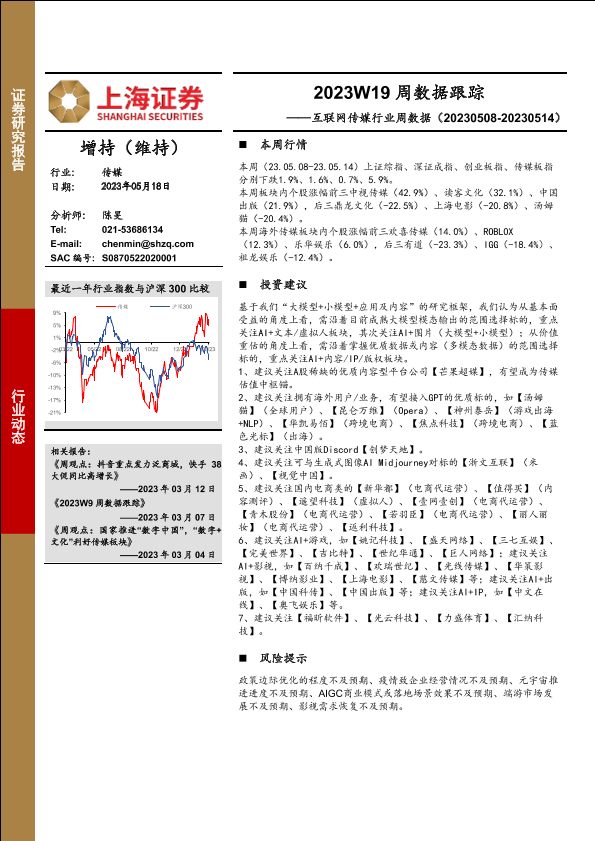 【上海证券】【20230518】互联网传媒行业周数据:2023W19周数据跟踪-21页