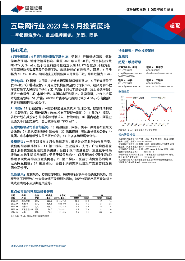 【国信证券】【20230515】互联网行业2023年5月投资策略:一季报即将发布,重点推荐腾讯、美团、网易-18页
