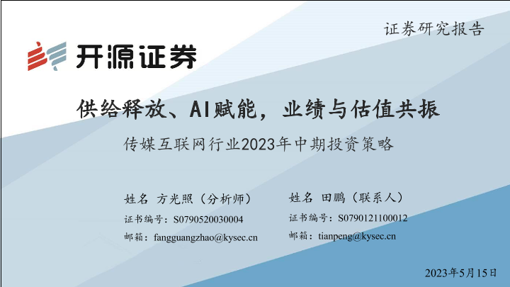 【开源证券】【20230515】传媒互联网行业2023年中期投资策略:供给释放、AI赋能,业绩与估值共振-40页