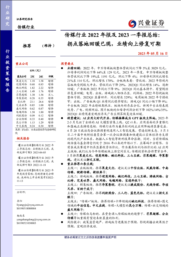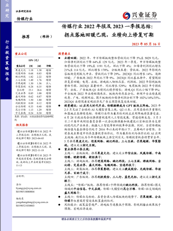 【兴业证券】【20230516】传媒行业2022年报及2023一季报总结:拐点落地回暖已现,业绩向上修复可期-35页