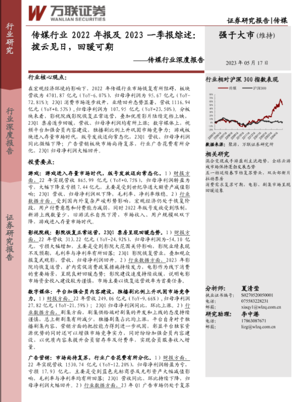 【万联证券】【20230517】传媒行业2022年报及2023一季报综述:拨云见日,回暖可期-35页