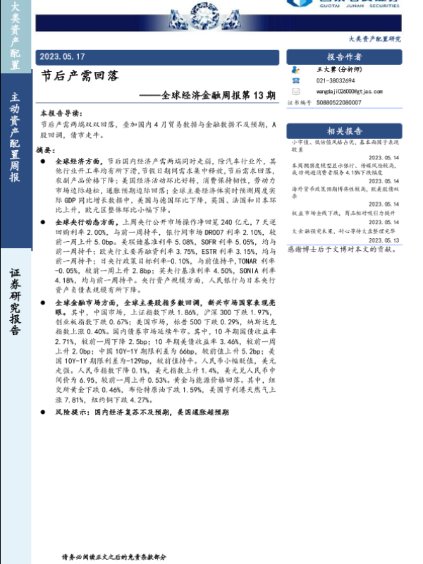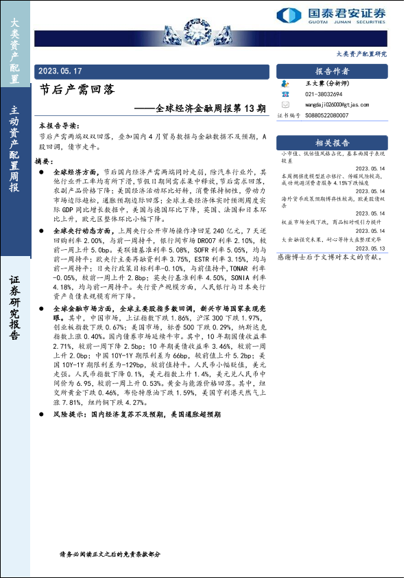 【国泰君安证券】【20230517】全球经济金融周报第13期:节后产需回落-17页