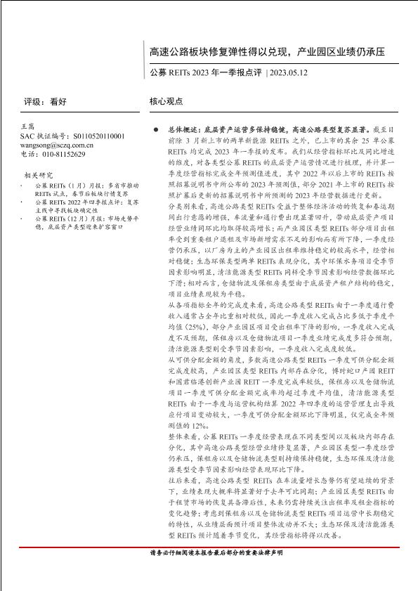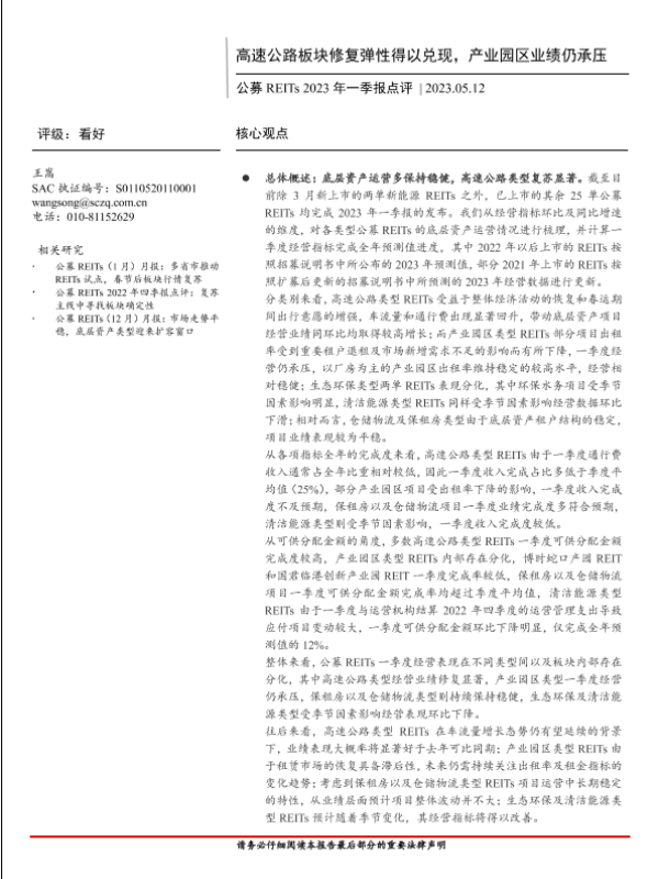 【首创证券】【20230512】公募REITs2023年一季报点评:高速公路板块修复弹性得以兑现,产业园区业绩仍承压-23页