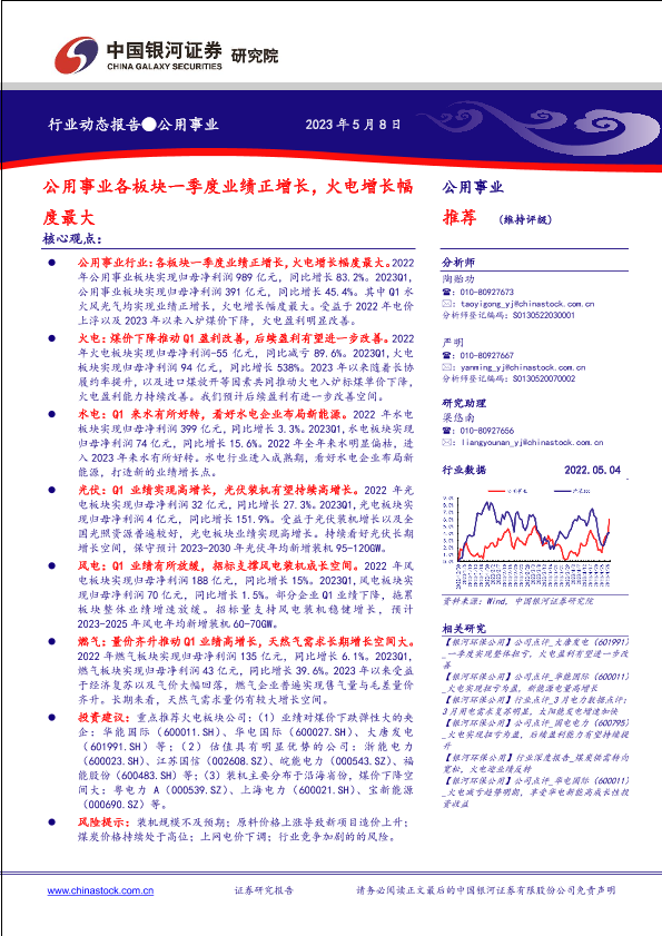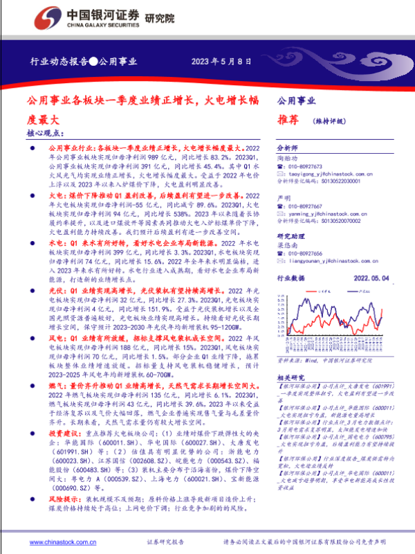 【银河证券】【20230508】公用事业各板块一季度业绩正增长,火电增长幅度最大-22页