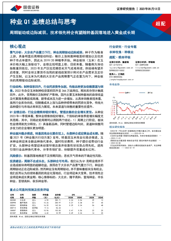 【国信证券】【20230513】农林牧渔行业种业Q1业绩总结与思考:周期驱动或边际减弱,技术领先种企有望随转基因落地进入黄金成长期-28页