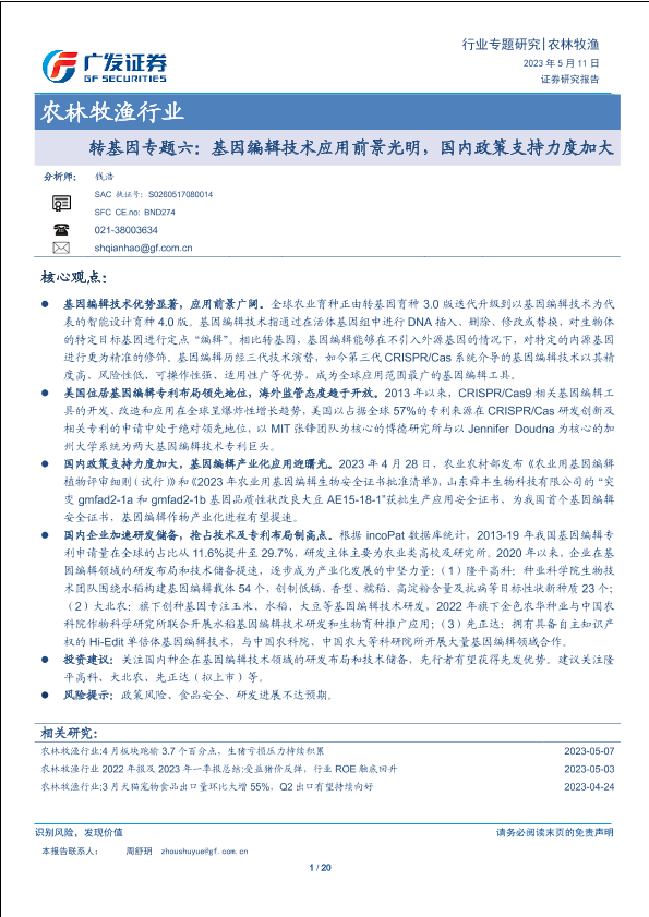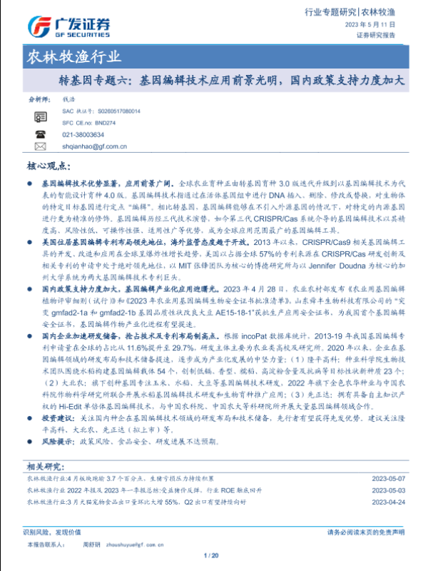 【广发证券】【20230511】农林牧渔行业转基因专题六:基因编辑技术应用前景光明,国内政策支持力度加大-20页