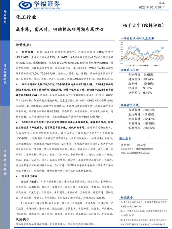 【华福证券】【20230507】化工行业专题研究:成本降,需求升,回购提振顺周期布局信心-26页