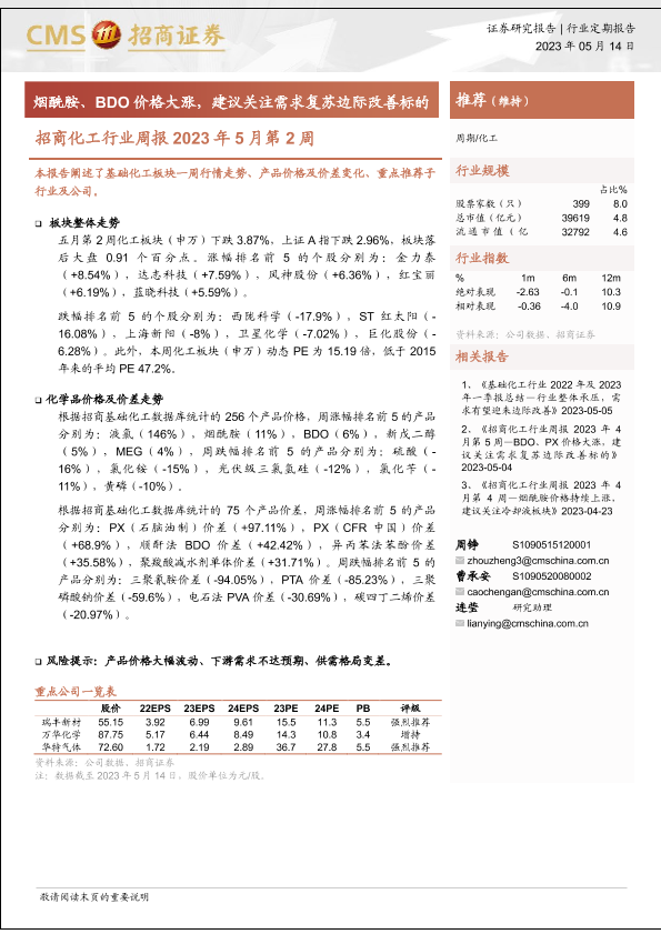 【海通证券】【20230514】化工行业周报2023年5月第2周:烟酰胺、BDO价格大涨,建议关注需求复苏边际改善标的-20页