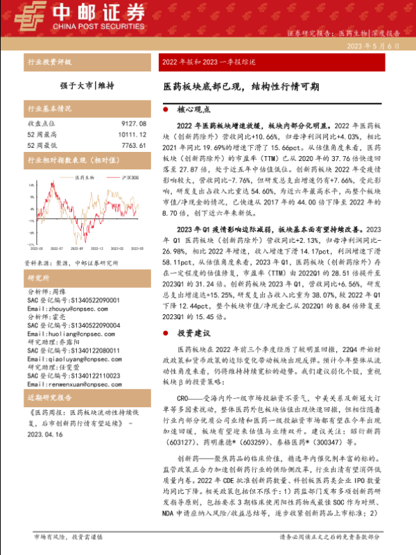 【中邮证券】【20230506】医药生物行业2022年报和2023一季报综述:医药板块底部已现,结构性行情可期-32页