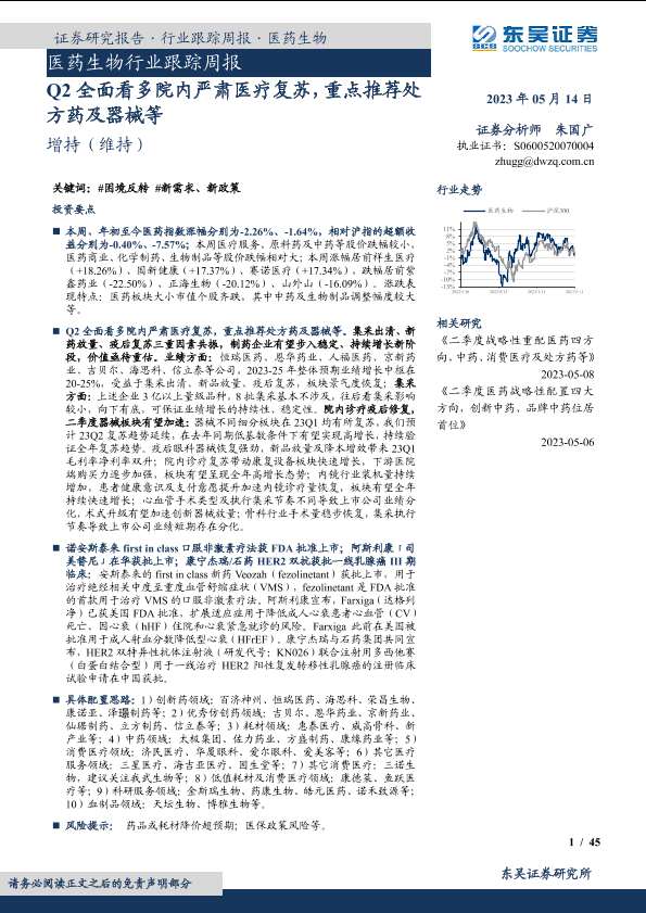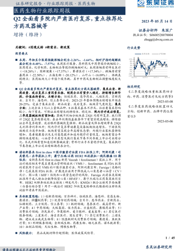 【东吴证券】【20230514】医药生物行业跟踪周报:Q2全面看多院内严肃医疗复苏,重点推荐处方药及器械等-45页