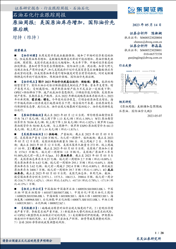 【东吴证券】【20230514】原油周报:美国原油库存增加,国际油价先涨后跌-28页