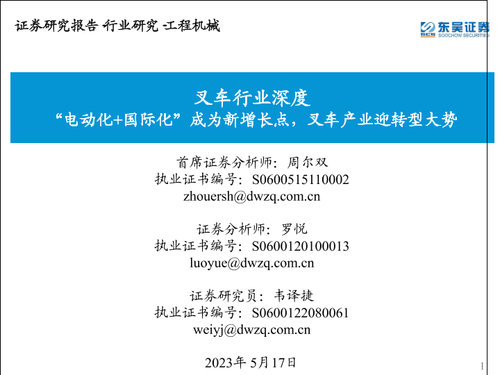 【东吴证券】【20230517】叉车行业深度:“电动化+国际化”成为新增长点,叉车产业迎转型大势-39页
