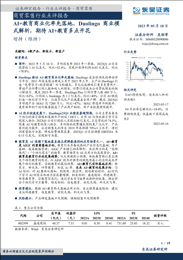 【东吴证券】【20230518】商贸零售行业点评报告:AI+教育商业化率先落地,Duolingo商业模式解析,期待AI+教育多点开花-19页