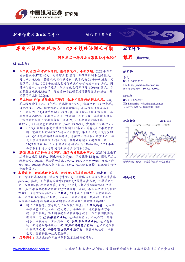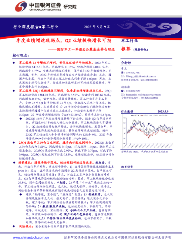 【银河证券】【20230509】国防军工一季报&公募基金持仓综述:季度业绩增速现拐点,Q2业绩较快增长可期-21页