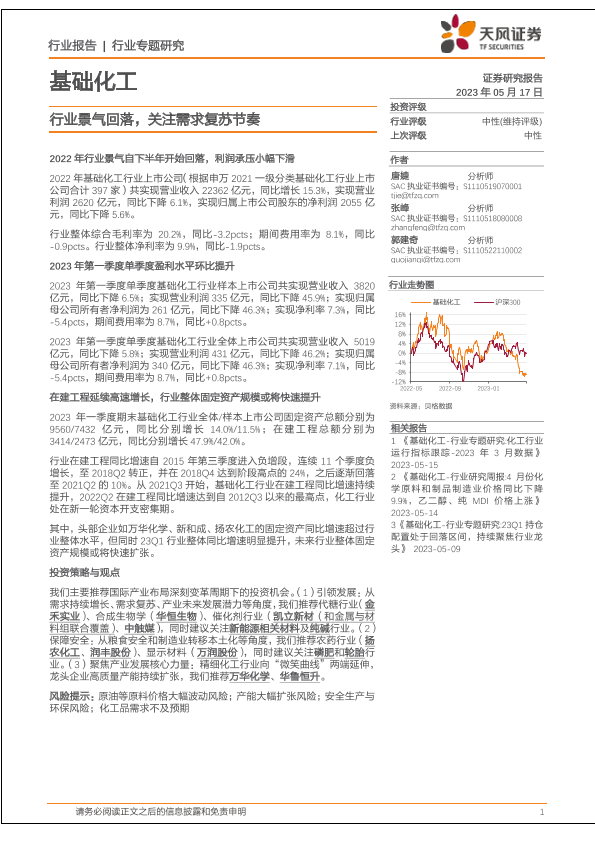 【天风证券】【20230517】基础化工行业专题研究:行业景气回落,关注需求复苏节奏-23页