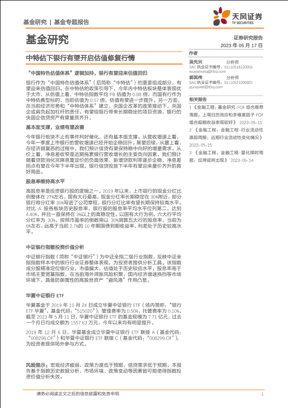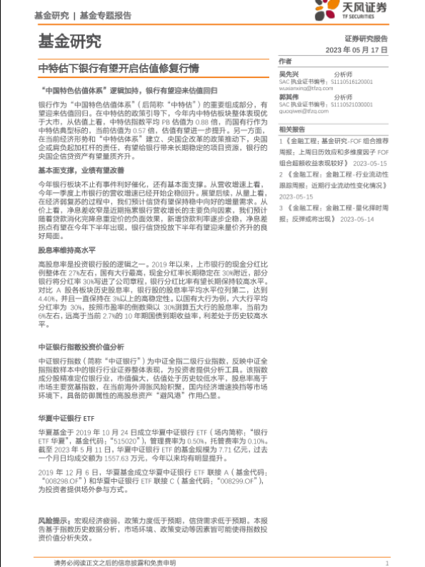 【天风证券】【20230517】基金研究:中特估下银行有望开启估值修复行情-18页