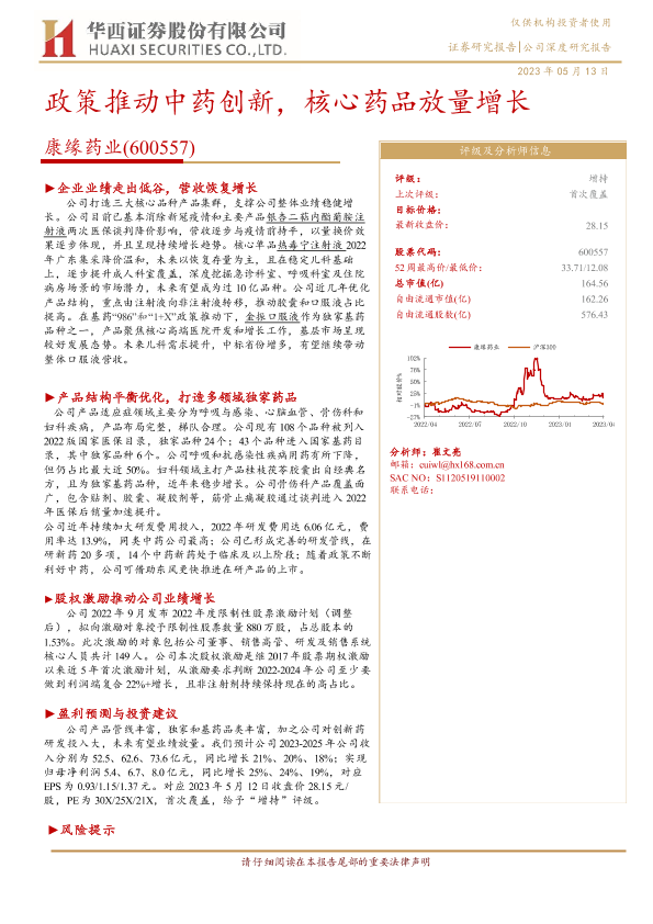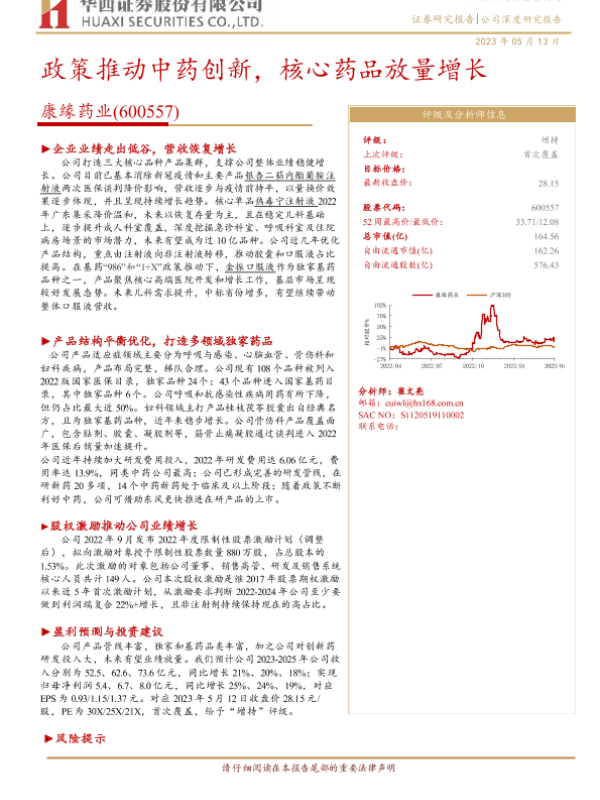 【华西证券】【20230513】康缘药业(600557)政策推动中药创新,核心药品放量增长-28页