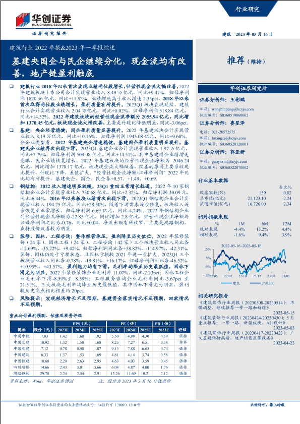 【华创证券】【20230516】建筑行业2022年报&2023年一季报综述:基建央国企与民企继续分化,现金流均有改善,地产链盈利触底-22页