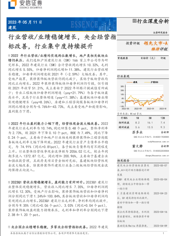 【安信证券】【20230511】建筑行业深度分析:行业营收业绩稳健增长,央企经营指标改善,行业集中度持续提升-45页