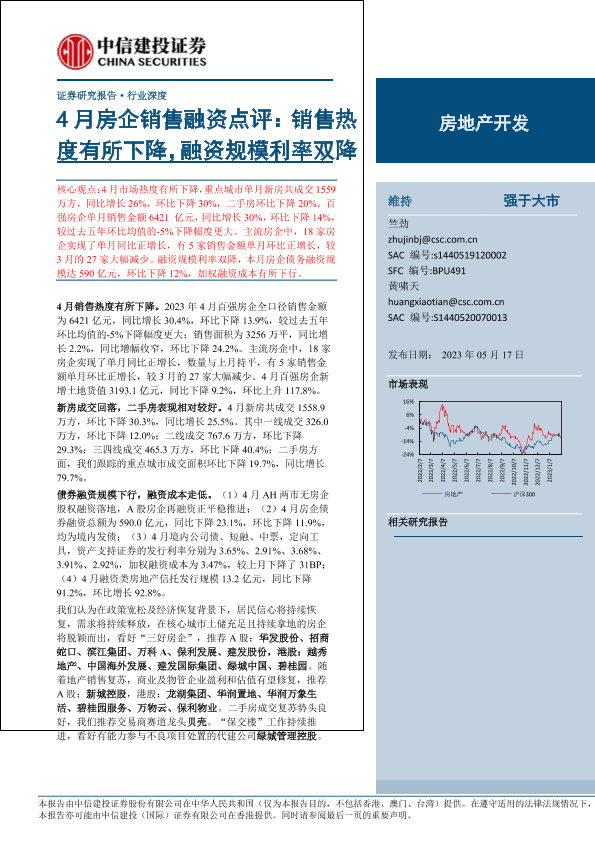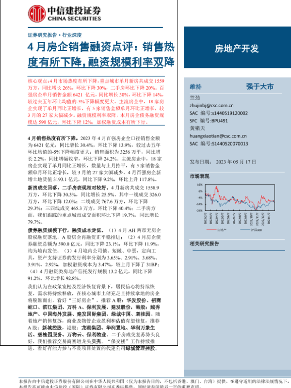 【中信建投证券】【20230517】房地产开发行业4月房企销售融资点评:销售热度有所下降,融资规模利率双降-24页