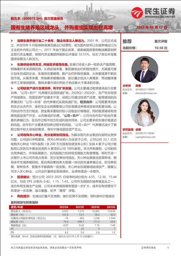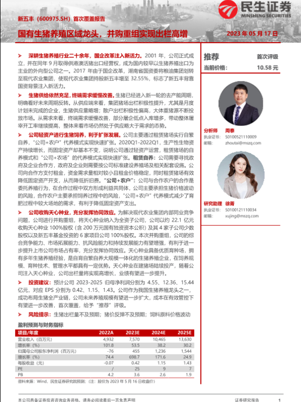 【民生证券】【20230517】新五丰(600975)首次覆盖报告:国有生猪养殖区域龙头,并购重组实现出栏高增-21页