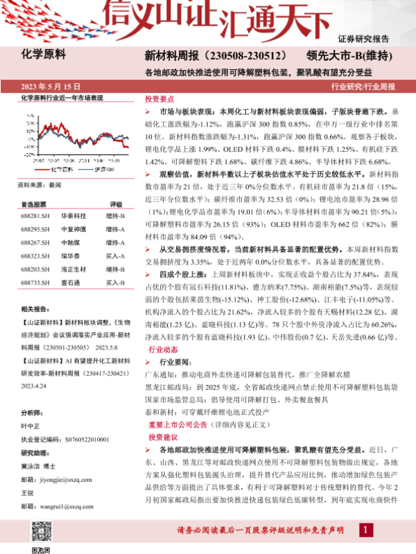 【山西证券】【20230515】新材料周报:各地邮政加快推进使用可降解塑料包装,聚乳酸有望充分受益-27页