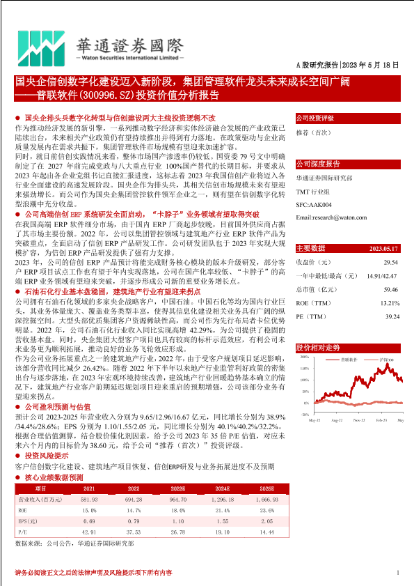 【华通证券国际】【20230518】国央企信创数字化建设迈入新阶段,集团管理软件龙头未来成长空间广阔 ——普联软件(300996.SZ)投资价值分析报告-30页